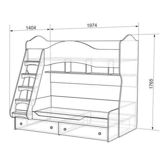 Нижнее спальное место размером 120х190 см, основание ЛДСП. Верхнее спальное место размером 80х190 см, основание ЛДСП. Доступ к нему обеспечивают удобные ступени с антискользящим покрытием. Конструкция кровати универсальная, сборка возможна как на правую, так и на левую стороны.