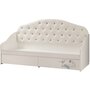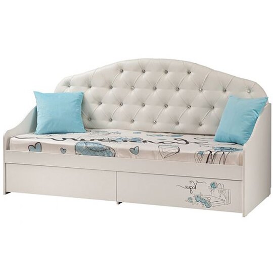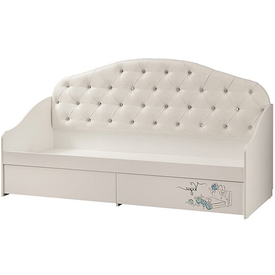 Кровать Гламур - комфортная детская кровать с безопасными сглаженными поверхностями и с мягкой пристенной панелью из экокожи, декорированной каретной стяжкой и пуговицами-стразами. Под спальным местом расположены два выдвижных ящика для белья с шариковыми направляющими. Фасад левого ящика декорирован авторским принтерным рисунком в стиле всей коллекции мебели Гламур. В основании кровати - пятниковые опоры для защиты напольного покрытия. Корпус кровати изготовлен из ЛДСП в белой тонировке, фасад - из МДФ в тонировке белый глянец. Спальное место размером 80 х 190 см. Две интерьерные подушки входят в комплект.