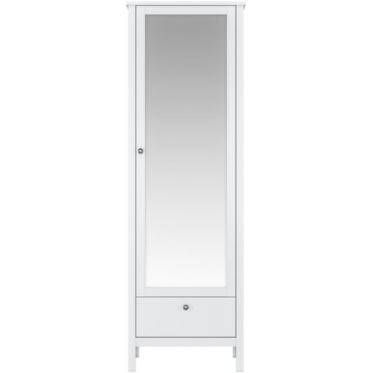Особенности шкафа. Несмотря на компактные размеры, шкаф очень вместителен: он оснащен большим отделением с полками и нижним выдвижным ящиком. Фасадная часть распашной дверцы оснащена зеркалом, в которое можно рассмотреть себя во весь рост. Качественная фурнитура, устойчивая к износу, гарантирует долговечность и надежность конструкции.