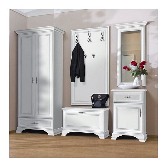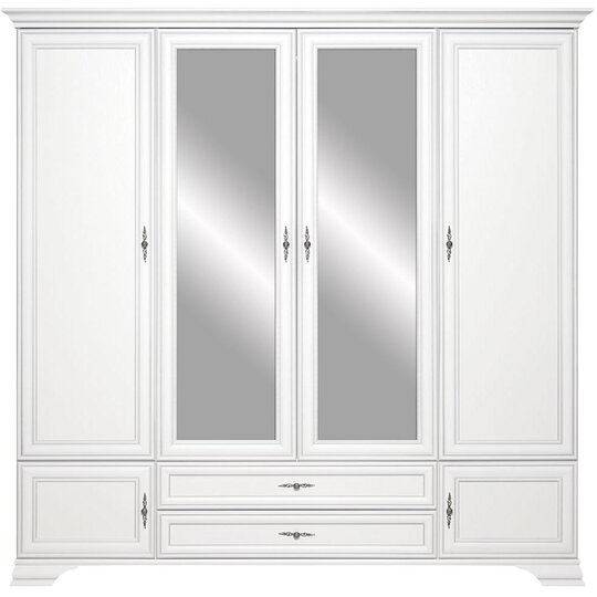 Особенности модели. Боковые отделения за распашными дверцами имеют полки. Центральное отделение за дверцами с зеркалом оборудовано штангой для вывески одежды. Внизу – два выдвижных ящика и два отделения с распашными дверцами.