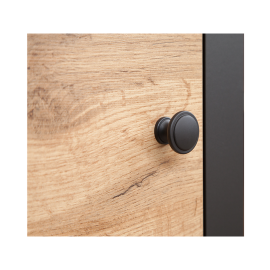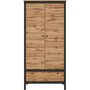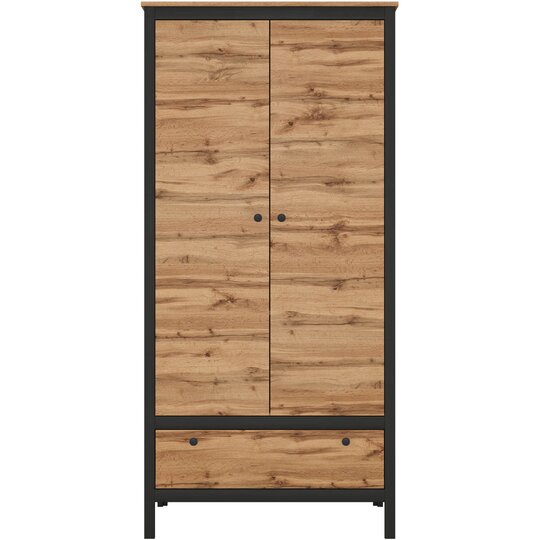 Легкая и функциональная конструкция на устойчивых высоких ножках включает в себя: основное отделение за двумя распашными дверьми, с металлической стационарной штангой для одежды и нижней полкой; а также вместительный полновыдвижной ящик на шариковых направляющих. Ход плавный и бесшумный. Ярко выраженная древесная текстура фасадов украшена контрастными черными рамками, имитирующими металл и аккуратными металлическми ручками. Такой контрастный и лаконичный дизайн – это актуальное сочетание для пространства в скандинавском или лофт стилях. Шкаф составит элегантный ансамбль с другими изделиями из коллекции Лофт.