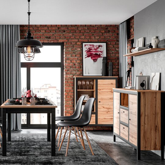 Полновыкатной ящик оснащен металлическими шариковыми направляющими: ход плавный и бесшумный. Ярко выраженная древесная текстура фасадов украшена контрастными черными рейками, имитирующих металл, и лаконичной фурнитурой в виде аккуратных металлических ручек. Такой дизайн позволяет органично дополнить интерьер в скандинавском и лофтовом стилях.