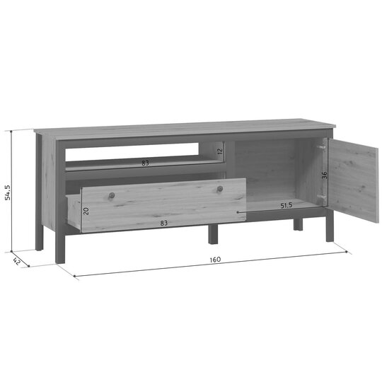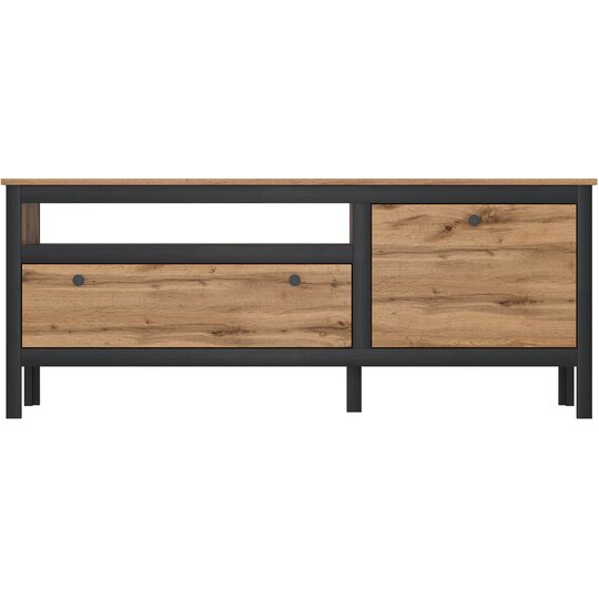 Тумба под телевизор Loft BRW  станет дополнением модульного комплекта или может использоваться самостоятельно в интерьере современной гостиной, спальни или просторного холла. Устойчивая модель с широким основанием отлично подходит для установки телевизора диагональю до 65 дюймов. Легкая и функциональная конструкция включает в себя три отделения: один выдвижной ящик на металлических направляющих, сквозная ниша с отверстием для проводов и отделение за распашной глухой дверью.
