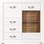 Особенности витрины. Большое отделение с частично застекленной дверью внутри оснащено стеклянной полкой. Три выдвижных ящика. Глубокое и вместительное отделение с откидной дверцей над ящиками. Оригинальная фурнитура подчеркивает стиль изделия.