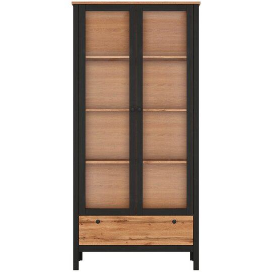 Элегантная витрина Loft BRW станет настоящим украшением интерьера гостиной, спальни или прихожей. Это отличное место для хранения посуды, сувениров или других предметов декора, создающих уют и индивидуальность помещения. Комбинированный фасад с прозрачными вставками. Легкая и функциональная конструкция на устойчивых высоких ножках включает в себя: четыре отделения с полками за распашными дверьми с прозрачными вставками из стекла; а также нижний вместительный полновыдвижной ящик на шариковых направляющих. Ход плавный и бесшумный. Ярко выраженная древесная текстура фасадов украшена контрастными черными рамками, имитирующими металл, и аккуратными металлическими ручками. Такой контрастный и лаконичный дизайн – это актуальное сочетание для пространства в скандинавском или лофт стилях. Витрина составит элегантный ансамбль с другими изделиями из коллекции Лофт.