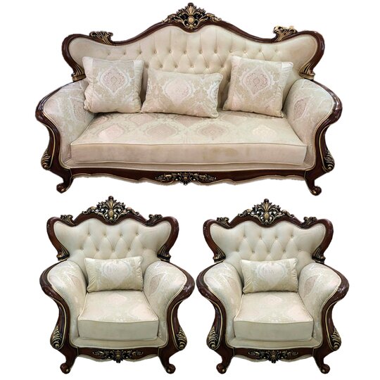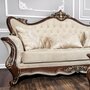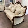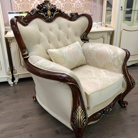 Комплект мягкой мебели Джоконда крем глянец - роскошный классический гарнитур мягкой мебели мягких изгибистых форм и с богатым декором, выполненным в тонировке крем глянец с золоченой патиной. Изделия комплекта обиты текстилем. Спинки изделий комплекта декорированы каретной стяжкой. Состав комплекта: Диван Джоконда крем глянец с французским раскладным механизмом - Ш225 х В125 х Г95 см. Кресло Джоконда крем глянец 2 шт. - Ш115 х В118 х Г95 см.