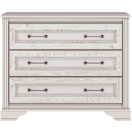 Особенности комода. Три вместительных выдвижных ящика, оснащенных металлическими роликовыми направляющими и оригинальной фурнитурой. Поверхность имитирует фактуру древесины.