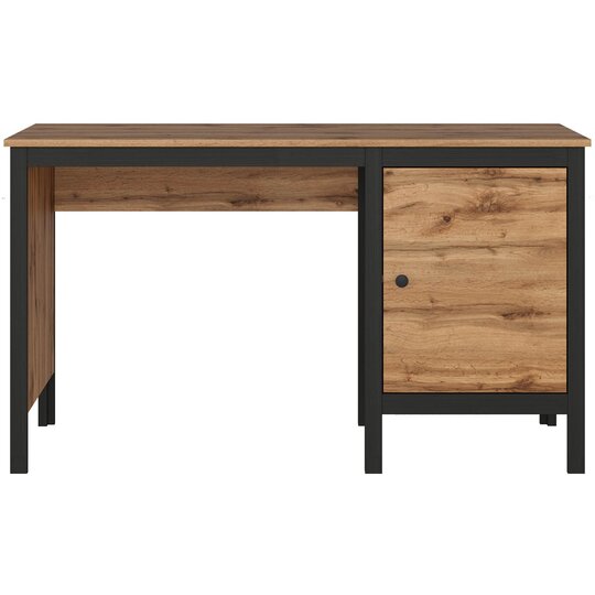 Современный письменный стол Loft BRW поможет рационально организовать рабочее пространство в кабинете или детской комнате. Модель имеет компактные размеры и обладает высокой степенью эргономичности. Конструкция стола легкая и функциональная. С правой стороны за распашной глухой дверью расположена вместительная тумба с двумя полками для хранения письменных принадлежностей. Ярко выраженная древесная структура фасадов окантована черными рейками, с имитацией поверхности металла.