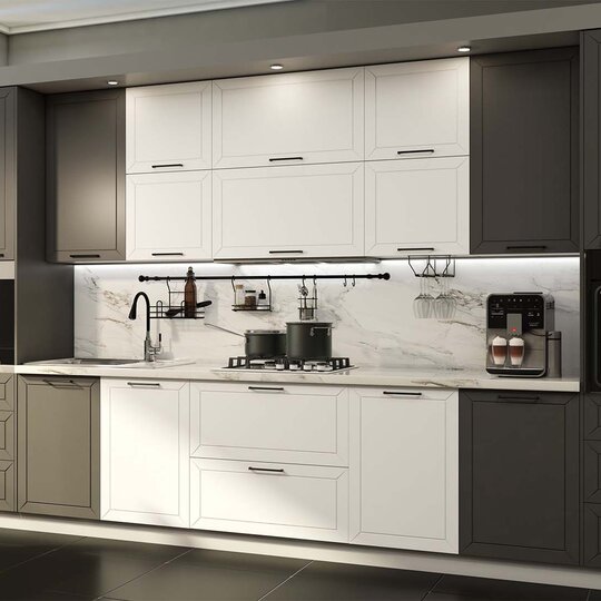 • Модули в корпусе в цвете Серый комплектуются петлями с возможностью установки демферов для плавного закрывания створок;