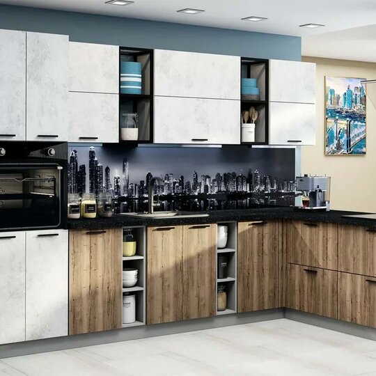 Шкаф навесной 550/912. Стильная кухня с широким выбором модулей и цветовых решений. Кухонный гарнитур «Модус» создан в соответствии с последними трендами в интерьере. Минималистичные фасады, имитирующие натуральные природные материалы, гармонично сочетаются с фурнитурой черного цвета. Гарнитур можно укомплектовать модулями с рамочными фасадами, а также комбинировать с дизайнерскими фасадами «Стайл» или «Модерн Нью».