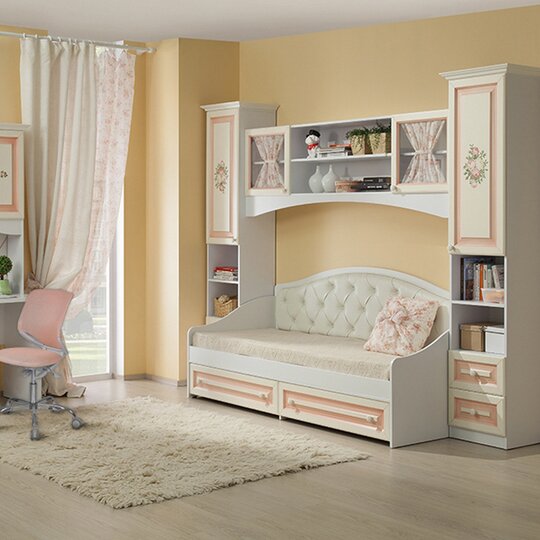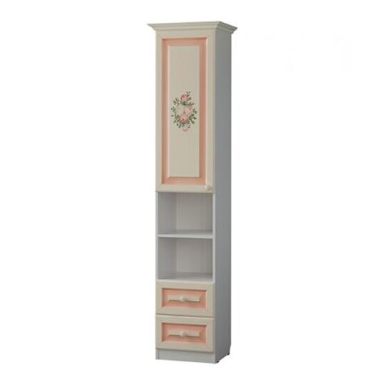 Шкаф комбинированный Алиса - модель в классическом дизайне с двумя выдвижными ящиками, выполненная из ЛДСП в нежно-бежевом цвете. Фасады из МДФ декорированы фрезеровкой, розовым патинированием и изображением цветочного букета, нанесенного при помощи стойкой к истиранию уф-печати. Наполнение шкафа - полки.