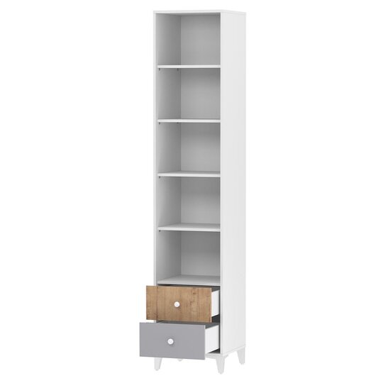 Шкаф-пенал открытый Морти имеет 5 полок и 2 ящика, что делает его идеальным для хранения вещей в детской комнате. Такой шкаф легко разместить в комнате любой площади. Ящики с фасадами выполнены в популярных нейтральных оттенках, которые характерны для скандинавского и современного стилей интерьера. Они выдвигаются на шариковых направляющих, которые обеспечивают плавное и тихое выдвижение, а также равномерное распределение веса содержимого. Длинные ножки делают конструкцию менее громоздкой и облегчают уборку. Ручки круглой формы идеально подходят для этого шкафа.