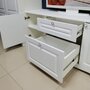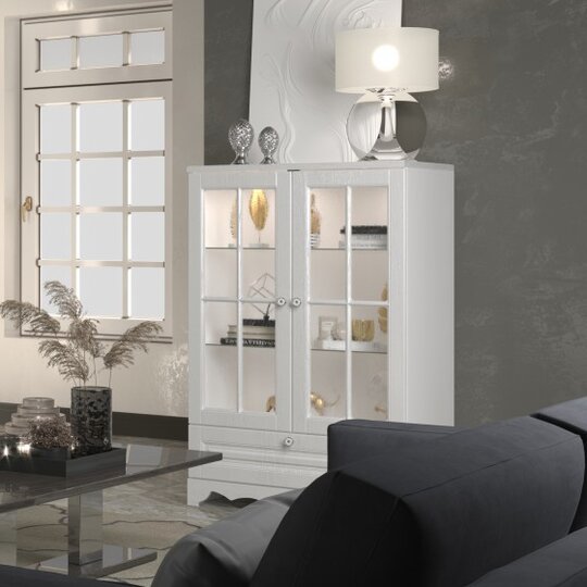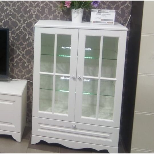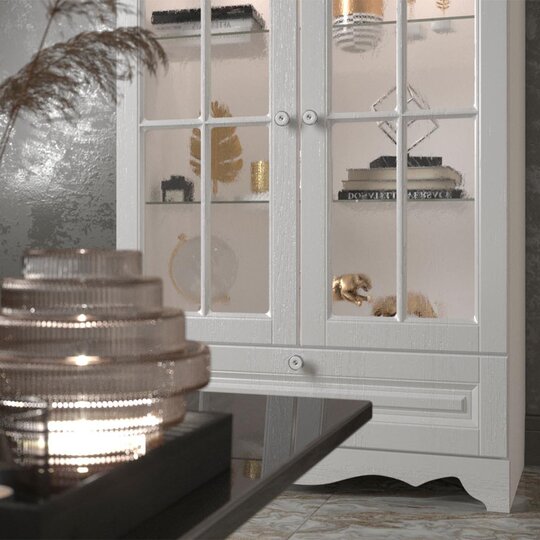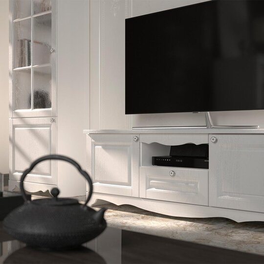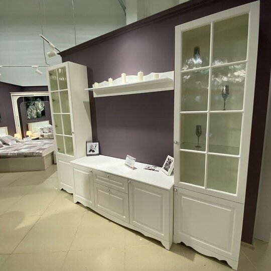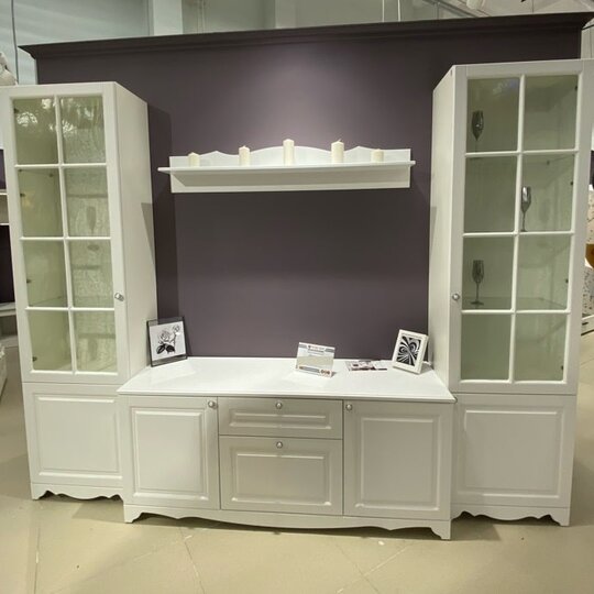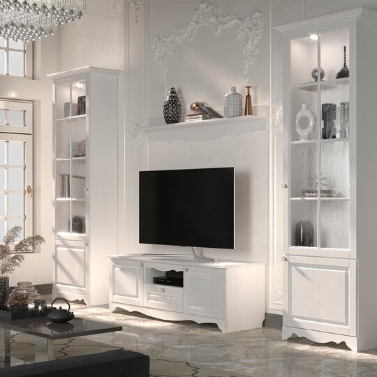 Изысканная модульная система для гостиной Версаль выполнена в современном французском стиле. Легкие и воздушные фасады белого цвета с мягкой древесной структурой, решетчатые фасады со сквозной фрезеровкой и эффектное стекло, создающее ощущение льющейся воды, а также стильные ручки-кнопки прекрасно вписываются в общую концепцию. Также изделие может комплектоваться декоративным карнизом.