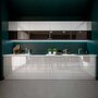Кухня выполнена в минималистичном дизайне: цельные гладкие поверхности, строгая геометрия шкафов и лаконичный декор. Всё внимание приковано к высокому глянцу фасадов. Зеркальные отражения наполняют помещение мягким светом и визуально расширяют пространство. Это настоящая находка для небольших или тёмных помещений. В интерьере глянец удачно комбинируется с большим количеством фактур и цветовых решений.