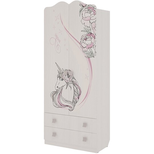 Шкаф комбинированный с ящ. 2-створчатый Фэнтези содержит 2 больших выкатных ящика и вместительное закрытое отделение за распашными дверцами с 1 полкой и горизонтальной штангой. На фасады шкафа нанесен, устойчивый к истиранию и ультрафиолету, фантазийный принт. Шкаф выполнен из ЛДСП класса Е1 толщиной 1,6 см в цвете рамух белый. Модель не универсальна по установке фасадов.