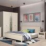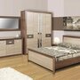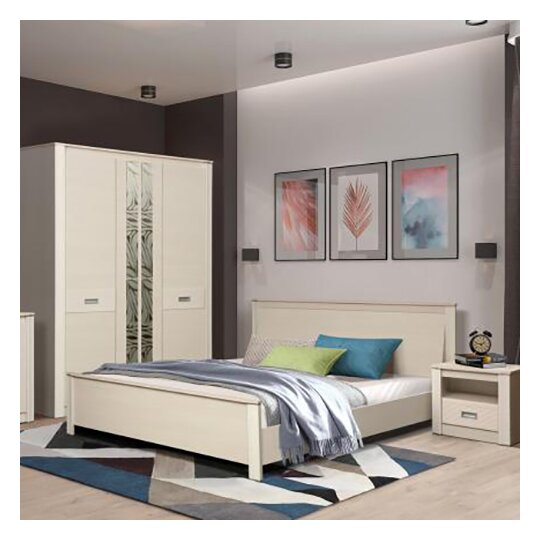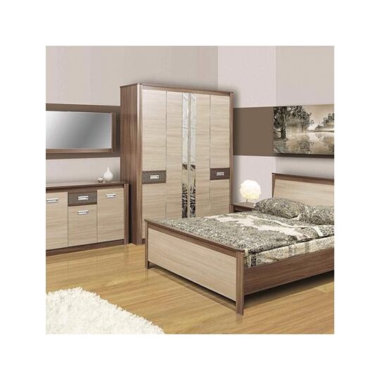 Мебельный гарнитур Стелла обладает эстетичным дизайном и позволяет комфортно организовать пространство в спальне. Гарнитур выполнен в тёплой бежево-коричневой гамме. Центральную часть шкафа украшают зеркальные полосы с декоративным рисунком. Тумбы оснащены выдвижными ящиками и полыми нишами в верхней части. Кровать имеет удобное наклонное изголовье.