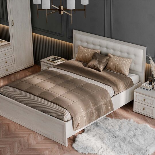 Элегантная модульная система для гостиной «Александрия» выполнена в стиле современной классики. Светлый цвет фасадов (сосна Санторини) оттеняет эксклюзивная рамка с бронзовой патиной, что только подчеркивает аристократичность этой мебели.