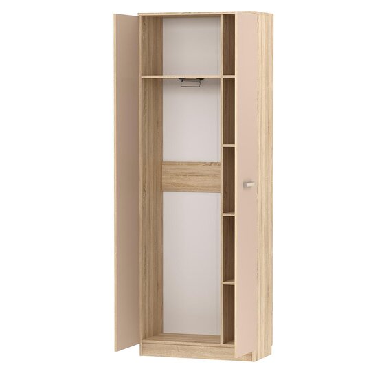 Шкаф Акварель — это двухстворчатый шкаф, который поможет организовать удобное хранение вещей. Благодаря своей компактности, доступ к вещам не будет затруднён. Внутри шкафа есть выдвижная штанга для вешалок с одеждой и 5 полок для других вещей. Глухие фасады шкафа защитят его содержимое от пыли и влаги.