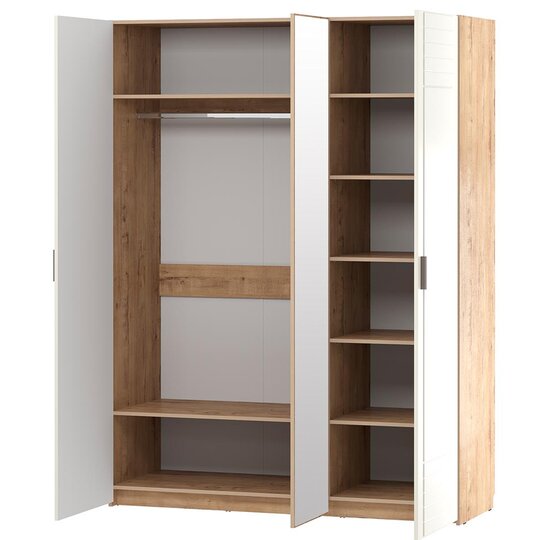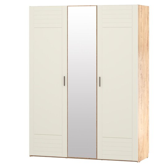 Шкаф «Livorno» — это трёхстворчатый шкаф. В левой части шкафа находятся 5 секций с полками для хранения белья, а в правой — отделение с вешалкой для верхней одежды. Полка антресольного типа подходит для хранения больших предметов, а нижний уровень — для размещения обуви в коробках. Фасад с зеркалом позволяет расширить функционал шкафа и визуально увеличить пространство помещения.