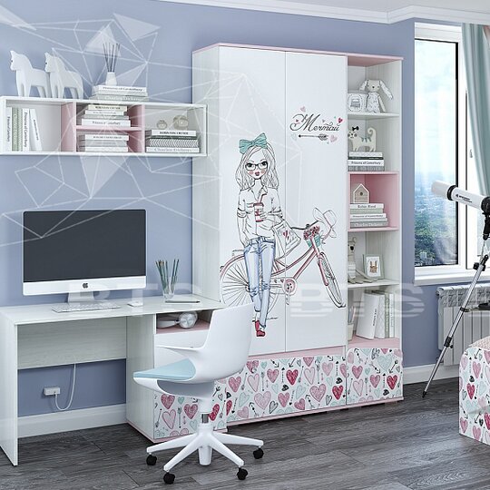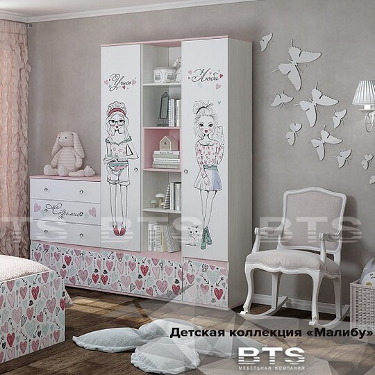 Нежные пудрово-розовые тона детской Малибу прекрасно сочетаются с классическим светлым декором корпусов и фасадов, на которые нанесен скетч-принт. "Малибу" - модульная система для детской комнаты, в которой проводит свое время девочка, верящая в себя, целеустремленная, постоянно познающая все новое и неизвестное, излучающая любовь и гармонию.