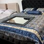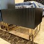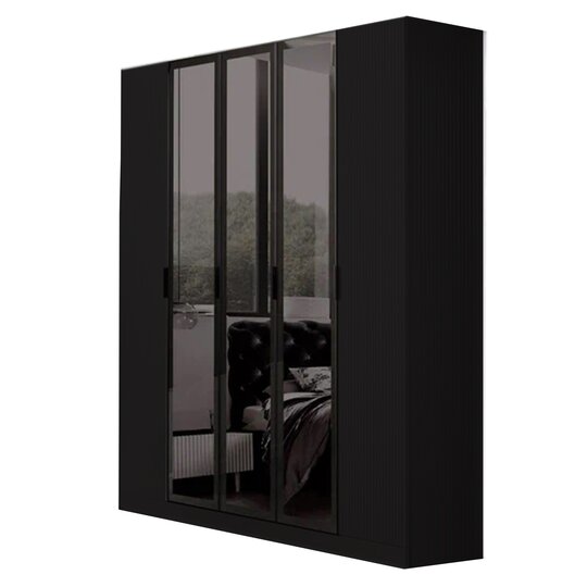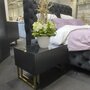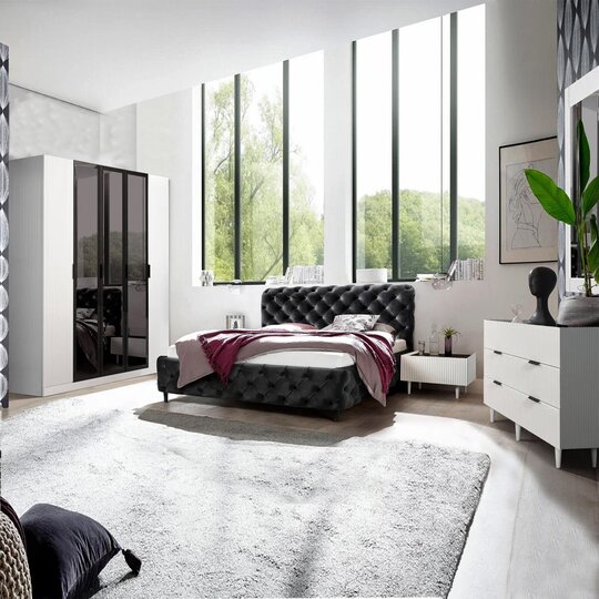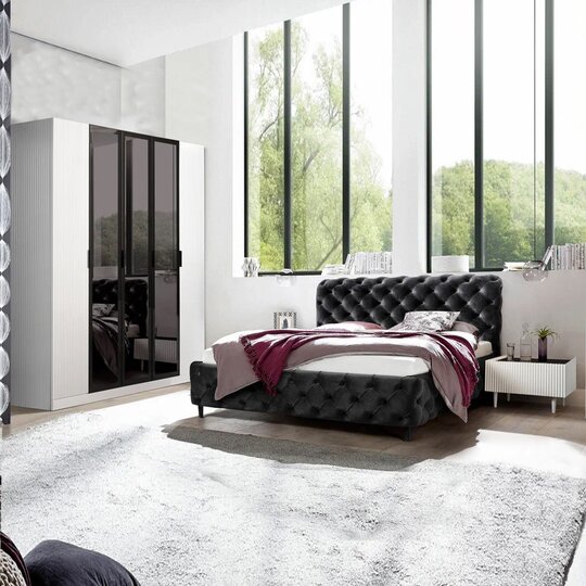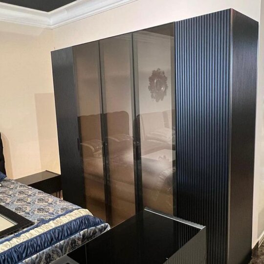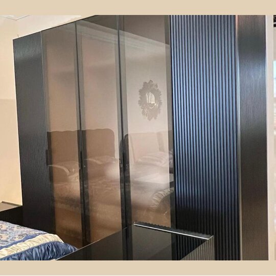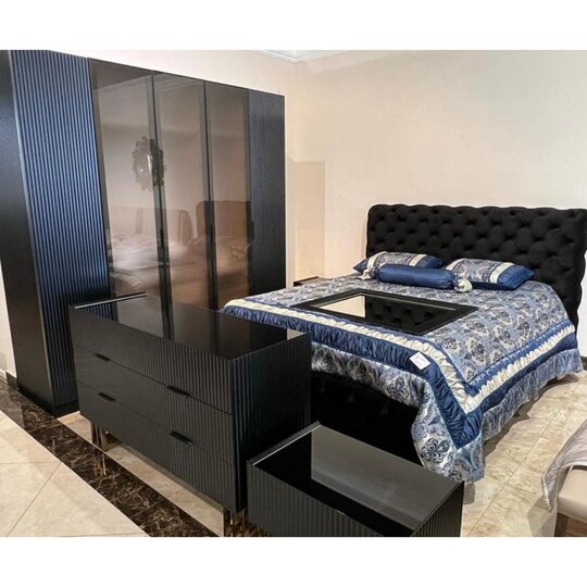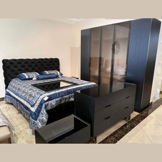 Спальня Наоми - особенная коллекция. В ней сочетаются современные тенденции и экзотический колорит, мужественность и грация. Уютная, с модным сочетанием цветов. Корпус в цвете черный выгодно подчеркивает орнаментальную фрезеровку! Кровать интерьерная с мягким изголовьем   – делает ее центром притяжения! Ведь кровать в спальне главный элемент мебели! Мебель на ножках в цвете золота выглядит воздушной, не утяжеляет модули, обеспечивает легкость пространства! Наоми-находка для любителей не обычного сочетания классики и лофта!