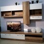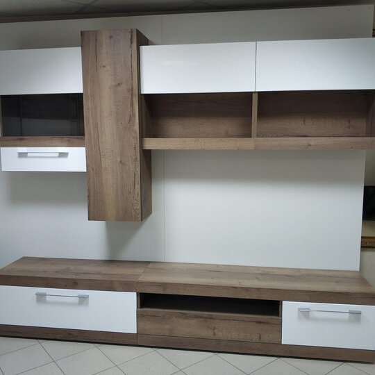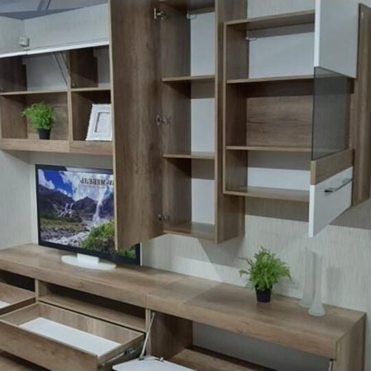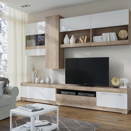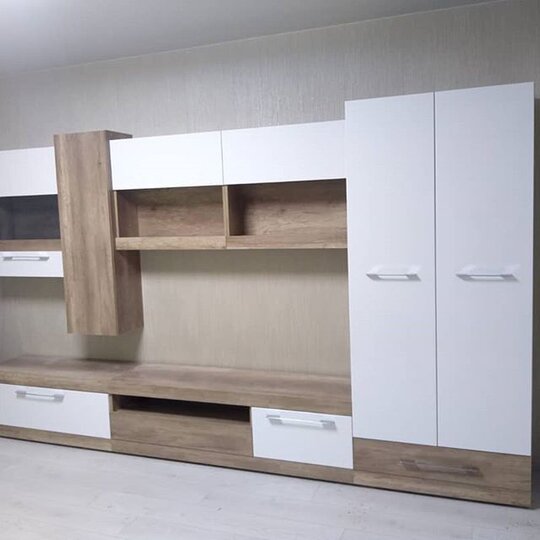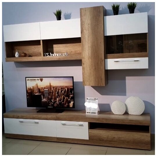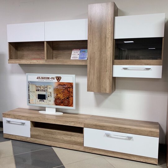 Модульная гостиная Ницца от фабрики SV-Мебель выполнена в лаконичном сочетании белого глянца и дерева.
