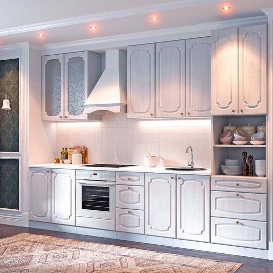 Гарнитур можно доукомплектовать карнизом, цоколем, доводчиками на выкатные ящики и демпферами на петли створок.