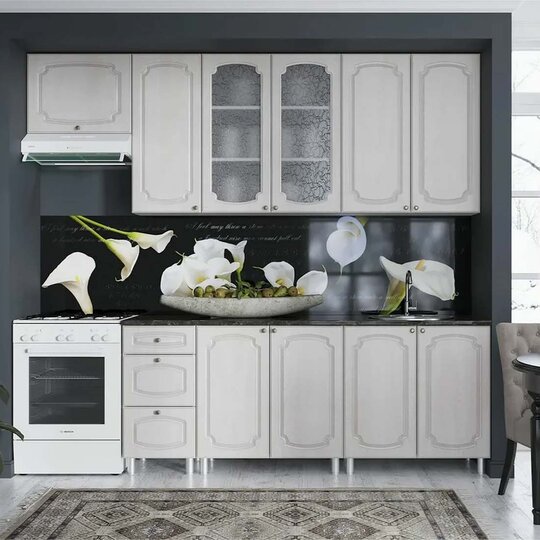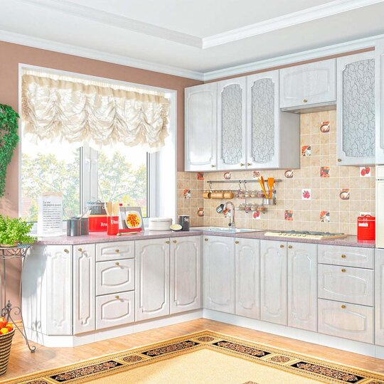 Гарнитур можно доукомплектовать карнизом, цоколем, доводчиками на выкатные ящики и демпферами на петли створок.