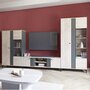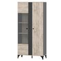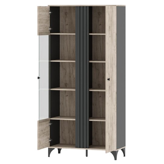 Шкаф оснащен двумя распашными дверьми с полками для хранения вещей. За фасадом из закаленного стекла можно расположить посуду, книги или элементы декора, а высокие опоры обеспечивают быстрый и легкий доступ во время уборки. Сборка шкафа универсальна – фасад-витрина может крепиться как на правую, так и на левую стороны.