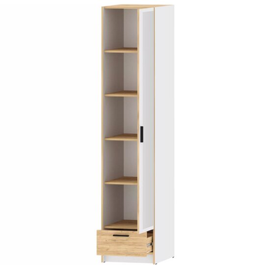 Шкаф оснащен пятью полками для хранения вещей, а также выдвижным ящиком с шариковыми направляющими, за счет которых ящик выдвигается плавно и бесшумно. Шкаф является модульным, что позволяет комбинировать его с другими шкафами из одноименной коллекции. Лаконичный дизайн шкафа гармонично подчеркивается черными ручками. Сборка шкафа универсальна – дверь может крепиться как на правую, так и на левую стороны