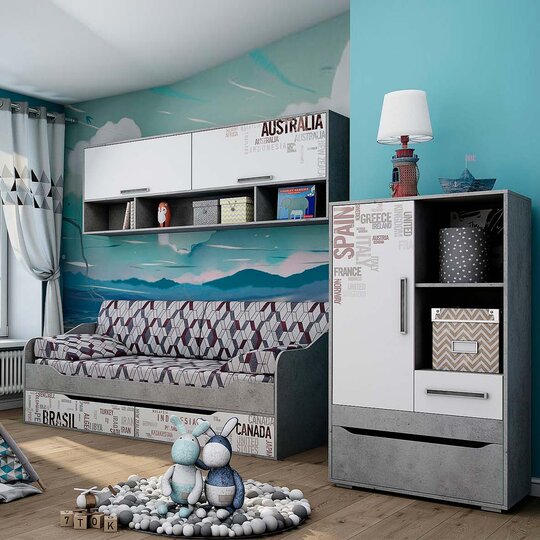 Модульная система выдержанная в динамичном и современном стиле, который понравится детям и подросткам. Стильное сочетание корпуса в цвете Цемент Светлый и фасада Белого цвета. Два варианта исполнения с фотопечатью или без расширяют возможности по планированию интересного интерьера детской комнаты. Модули гарнитура комплектуются петлями «Titus» с возможностью установки демпферов и регулируемыми по высоте опорами. Выдвижные ящики комплектуются телескопическими направляющими полного выдвижения. Обращаем Ваше внимание, что открытые торцы всех деталей гарнитура облицованы кромкой согласно стандартов, действующих для детской мебели. Безопасная мебель - залог здоровья ваших детей!