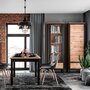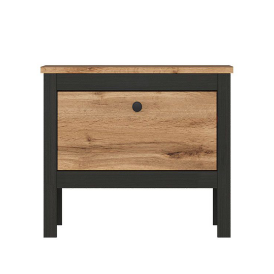 Легкая и функциональная конструкция на высоких устойчивых ножках, включает в себя один вместительный выдвижной ящик, оснащенный металлическими шариковыми направляющими. Ход плавный и бесшумный. Ярко выраженная древесная текстура фасадов украшена контрастными черными рейками, имитирующими металл и аккуратными металлическими ручками. Такой дизайн позволяет органично дополнить пространство в скандинавском или лофтовом стилях.