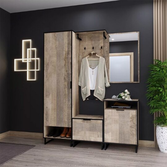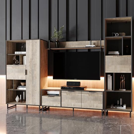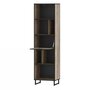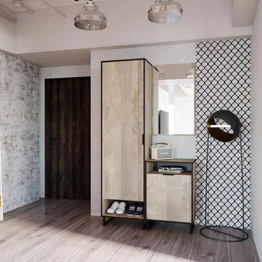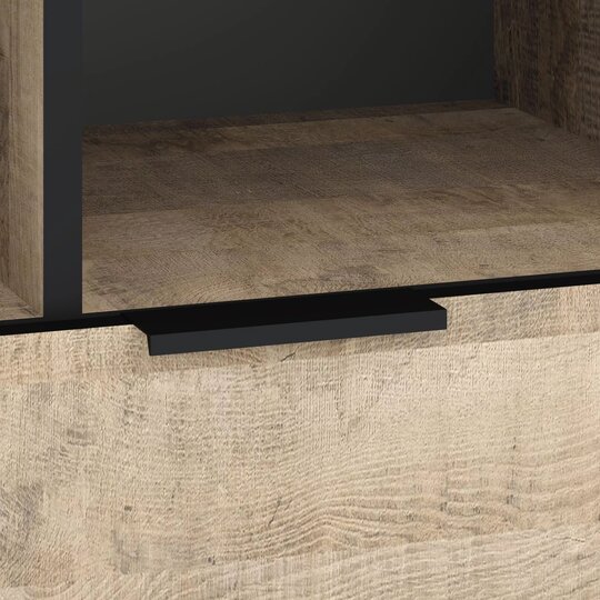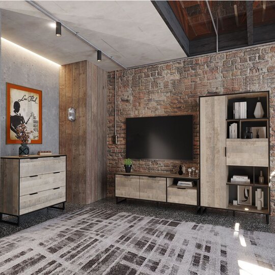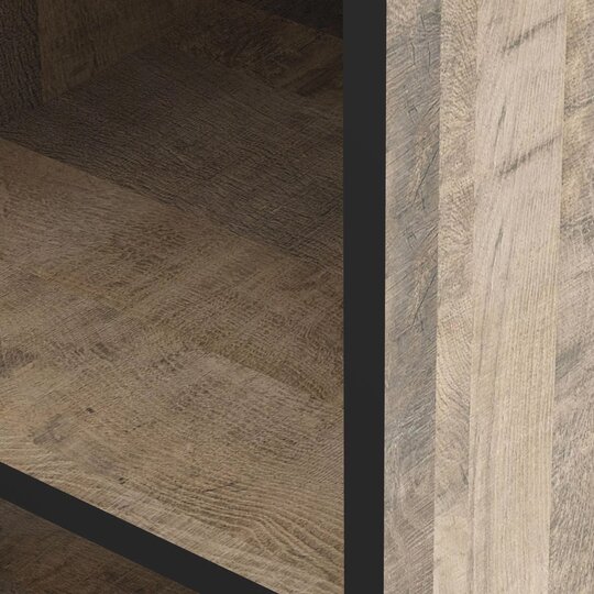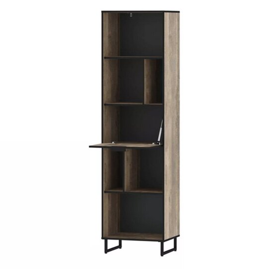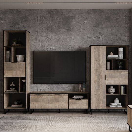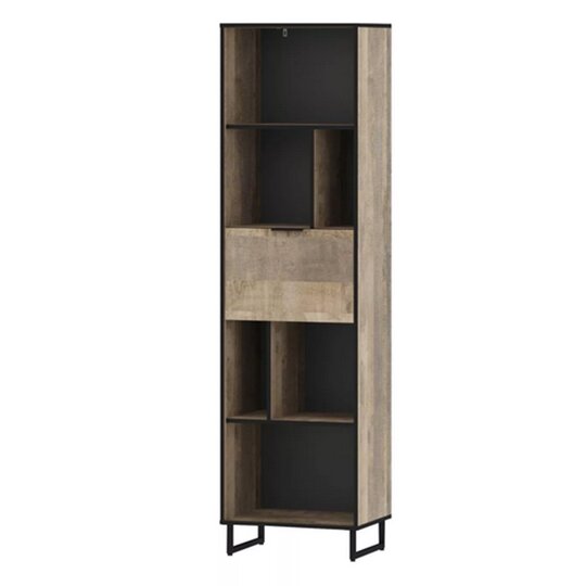 Стеллаж из коллекции Фолк легко впишется в интерьер гостиной в стиле Лофт, придав ей современный и монументальный вид. Черная лаконичная ручка и цельнометаллические опоры дополняют и подчеркивают оригинальный дизайн мебели, а черная окантовка стеллажа создает эффектную, выразительную линию, которая очерчивает контур фасадов темно-песочного цвета. Задняя стенка, выполненная из декоративного материала цвета антрацит, создает дополнительный эффект глубины.