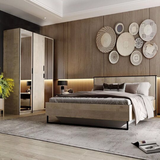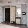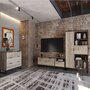 Черные лаконичные ручки и цельнометаллические опоры дополняют и подчеркивают оригинальный дизайн мебели, а черная окантовка создает эффектную, выразительную линию, которая очерчивает контур фасадов темно-песочного цвета. Задняя стенка, выполненная из декоративного материала цвета антрацит, создает дополнительный эффект глубины.