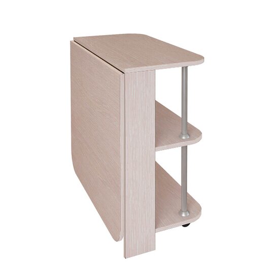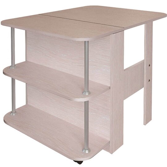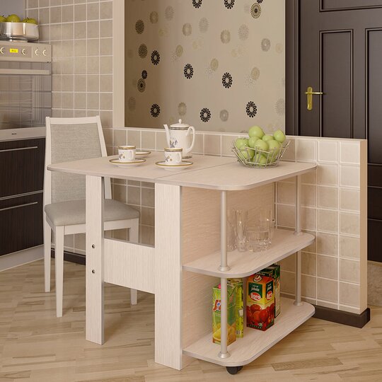 Незаменимый вариант для малогабаритной квартиры – стол-книжка Бабочка. Габариты в разложенном виде Ш*В*Г/мм/: 800*750*1100. В сложенном состоянии его можно поставить к стене и использовать в качестве комода, расположив на столешнице и открытых полках предметы декора, при необходимости модель раскладывается и становится обеденным столом, изделие выполнено из ЛДСП.