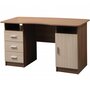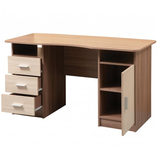 Письменный стол Меркурий оснащён двумя тумбами, что позволяет удобно выполнять различные виды работ и хранить значительное количество бумаг и предметов. Расстояние между тумбами составляет 560 мм. Рабочая поверхность имеет большую площадь, эстетике изделия способствуют скруглённые углы. Слева расположена секция, скрытая за глухой дверцей. Справа размещены три выдвижных ящика. По бокам выполнены полые ниши, обеспечивающие удобство расположения часто используемых предметов. Основной корпус оформлен в тёмной цветовой гамме, фасады – в светлой.