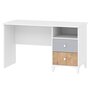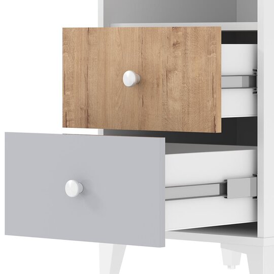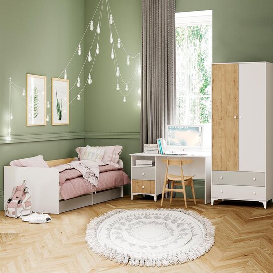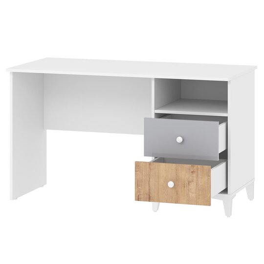 Стол письменный Морти с тумбой поможет создать удобный и уютный уголок для занятий. Белая столешница хорошо сочетается с контрастными ящиками. Этот стол также имеет небольшой модуль с двумя выдвижными ящиками и открытой полкой. Большая полка под столешницей идеально подходит для хранения книг и тетрадей. Тумба с ящиками может быть расположена как с левой, так и с правой стороны стола, в зависимости от предпочтений ребёнка. Выдвижные ящики имеют удобные ручки, которые легко выдвигаются и обеспечивают полный доступ к их содержимому, что позволяет быстро найти нужную вещь.
