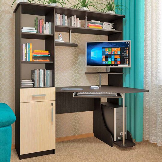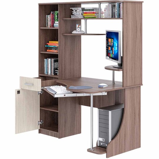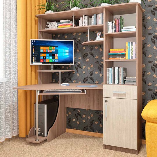 Идеальное соотношение цены и качества, удобство, эргономичность и стиль – всё это компьютерный стол СК-31. Угловая модель – отличный вариант для дома и офиса. Несмотря на небольшие габариты, СК-31 вмещает просторную столешницу с подставкой под монитор и выкатной полкой для клавиатуры. Также есть ниша под системный блок или хранение сумки, портфеля и папок. Правая часть модели состоит из встроенного пенала для документов с открытыми нишами, выдвижным ящиком и небольшим шкафом с распашной дверцей. К тому же шкаф снабжён мебельным замком для удобства хранения важной документации. Также вместительна и надстройка СК-31: на полке над монитором удобно хранить книги, а крыша надстройки создает дополнительное рабочее пространство. В качестве опор для столешницы и полок использованы хромированные трубы. Всё это в конечном итоге образует пространство, способствующее продуктивной учёбе и работе.  Теперь этот стол ( Универсальный ). Можно собрать как левый, так и правый.