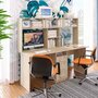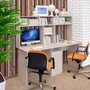 Стол компьютерный СК-58 отличается от других моделей тем, что имеет одновременно два рабочих места. Изделие выполнено настолько просто и вместе с тем эргономично, что не вызывает сомнений в своей привлекательности. Нижняя часть стола имеет тумбу с тремя выдвижными ящиками и открытой нишей над ними. Тумба является условным разделителем между рабочими местами. Верхняя часть стола содержит надстройку с открытыми полками. Верхняя часть надстройки также имеет полезную площадь для размещения на ней различных книг или любимого декора. Строгие прямые линии добавляют стильности этому современному изделию. Данная модель стола уже приглянулась как  офисникам для экономии места в помещении, так и семьям  для обучения умников и умниц.
