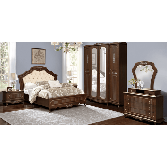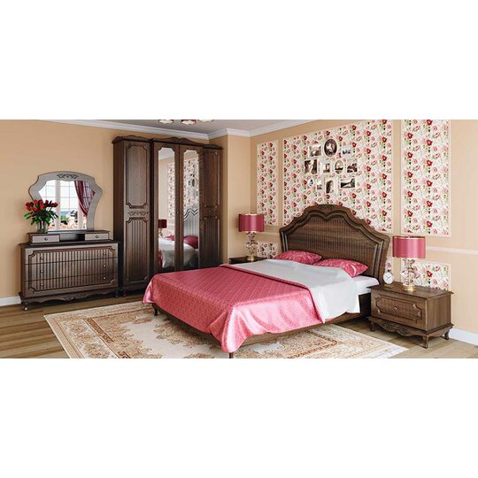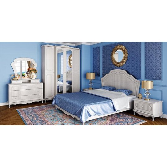 Спальня Кантри - это высококачественный набор спальной мебели. Мебель выполнена в ярком белом цвете и имеет стильный дизайн. Фасады всех элементов спальни имеют фактурный, объемный рисунок, что придает комплекту индивидуальность. В состав гарнитура могут входить шкаф для одежды, комфортабельная кровать, тумбочки и комод с зеркалом.