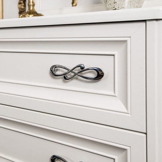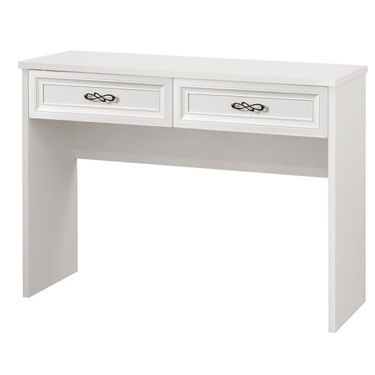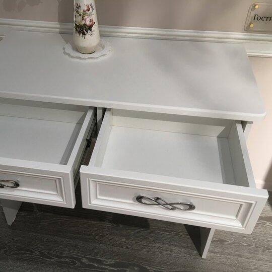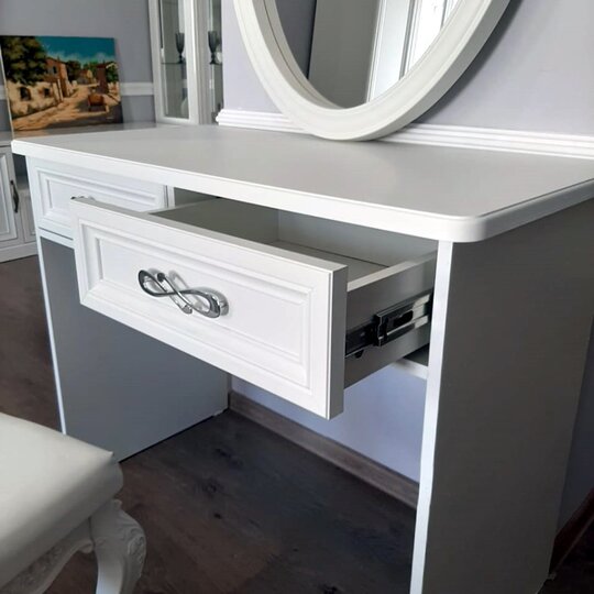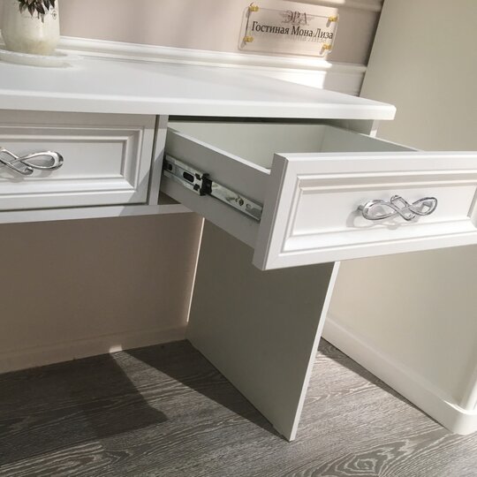 Стол туалетный Мишель-габаритный комод традиционного дизайна с четырьмя вместительными выдвижными ящиками на массивном основании. Ящики, с элегантно фрезерованными рамочными фасадами, декорированы витиеватыми металлическими ручками.