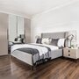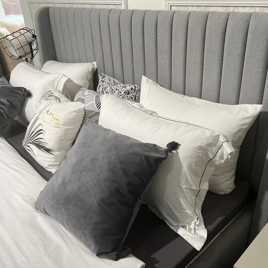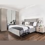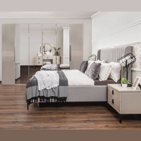 Спальня Стелла - особенная коллекция. В ней сочетаются современные тенденции и экзотический колорит, мужественность и грация. Уютная, с модным сочетанием цветов. Корпус в цвете светло серый камень выгодно подчеркивает орнаментальную фрезеровку, а яркие декоративные ручки–акцент на нестандартность! Кровать с мягким изголовьем на высоких ножках  – делает ее центром притяжения! Ведь кровать в спальне главный элемент мебели! Мебель на ножках в черном цвете выглядит воздушной, не утяжеляет модули, обеспечивает легкость пространства! Стелла-находка для любителей не обычного сочетания классики и лофта!