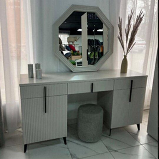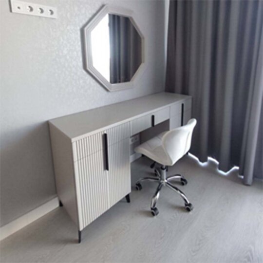 Вместительный туалетный стол с двумя тумбами, бесшумное и плавное закрывание дверей благодаря петлям с доводчиками, направляющие скрытого монтажа с доводчиками.