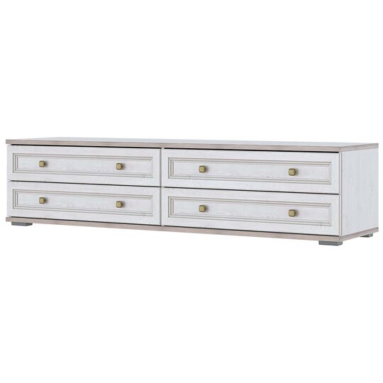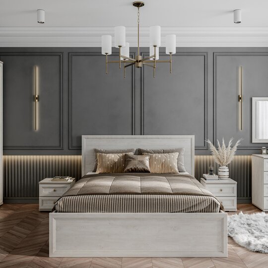 Элегантная модульная система для гостиной «Александрия» выполнена в стиле современной классики. Светлый цвет фасадов (сосна Санторини) оттеняет эксклюзивная рамка с бронзовой патиной, что только подчеркивает аристократичность этой мебели.
