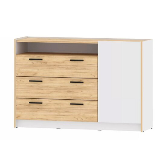 Тумба оснащена тремя выдвижными ящиками со встроенной перегородкой для удобного хранения вещей, а также распашной дверкой с полками и открытой нишей, чтобы легко расположить косметику или украшения, а также документы, если использовать тумбу в домашнем кабинете. Черные лаконичные ручки идеально контрастируют на песочном фасаде.