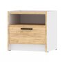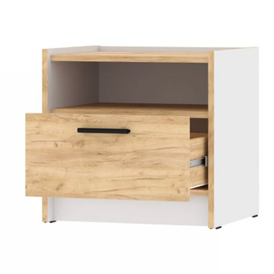 Тумба оснащена выдвижным ящиком с шариковыми направляющими, за счет которых ящик выдвигается плавно и бесшумно, а открытая ниша позволит удобно расположить все необходимые вещи. Песочный фасад гармонично подчеркивает черную лаконичную ручку.
