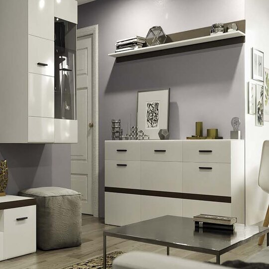 Модульная гостиная Соло - идеальное сочетание Белого глянца с декоративными элементами Венге, придаст вашей гостиной легкость и изящество. Все модули системы комплектуются надежными петлями Titus с возможностью установки демпферов (система плавного закрывания створок). Демпферы приобретаются за отдельную плату.