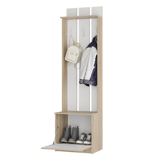 Модель Сакура идеально подойдет для небольшой прихожей. Изделие включает в себя открытые крючки для одежды, верхнюю полку для головных уборов и аксессуаров и нижнее отделение для хранения обуви, которое спрятано за дверцу, прихожая выполнена из высококачественной ЛДСП контрастных цветов венге и лоредо.