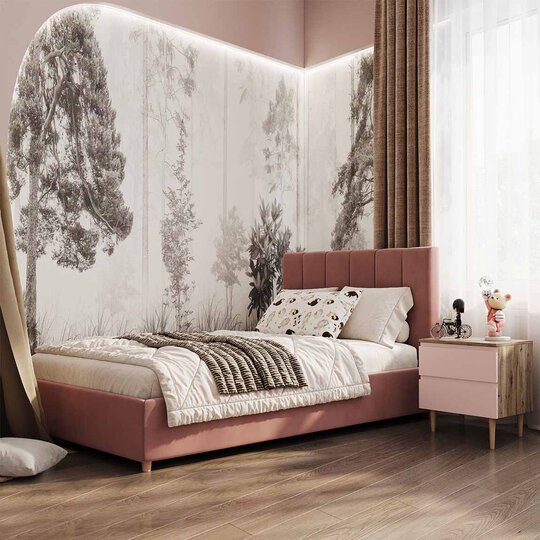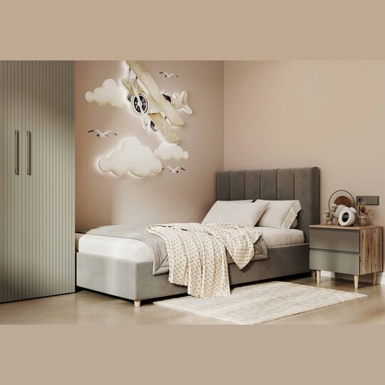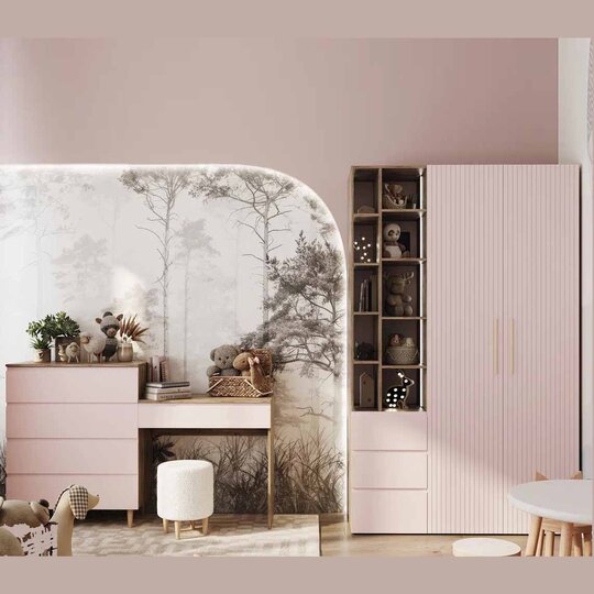 Вместительный шкаф позволит разместить все вещи, а декоративная подсветка придаст изюминку комнате. Удобный стол-комод поможет вашему ребенку с комфортом выполнять письменные задания. Прикроватная тумба, на которой можно разместить ночник и вещи, которые всегда должны быть под рукой. Стильная, мягкая кровать подарит отличный и здоровый сон, а мягкий пуф станет отличным и стильным завершением комнаты.