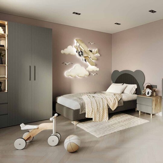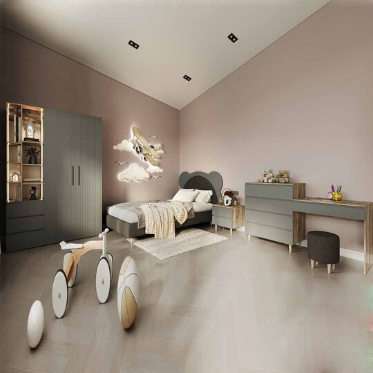 Вместительный шкаф позволит разместить все вещи, а декоративная подсветка придаст изюминку комнате. Удобный стол-комод поможет вашему ребенку с комфортом выполнять письменные задания. Прикроватная тумба, на которой можно разместить ночник и вещи, которые всегда должны быть под рукой. Стильная, мягкая кровать подарит отличный и здоровый сон, а мягкий пуф станет отличным и стильным завершением комнаты.